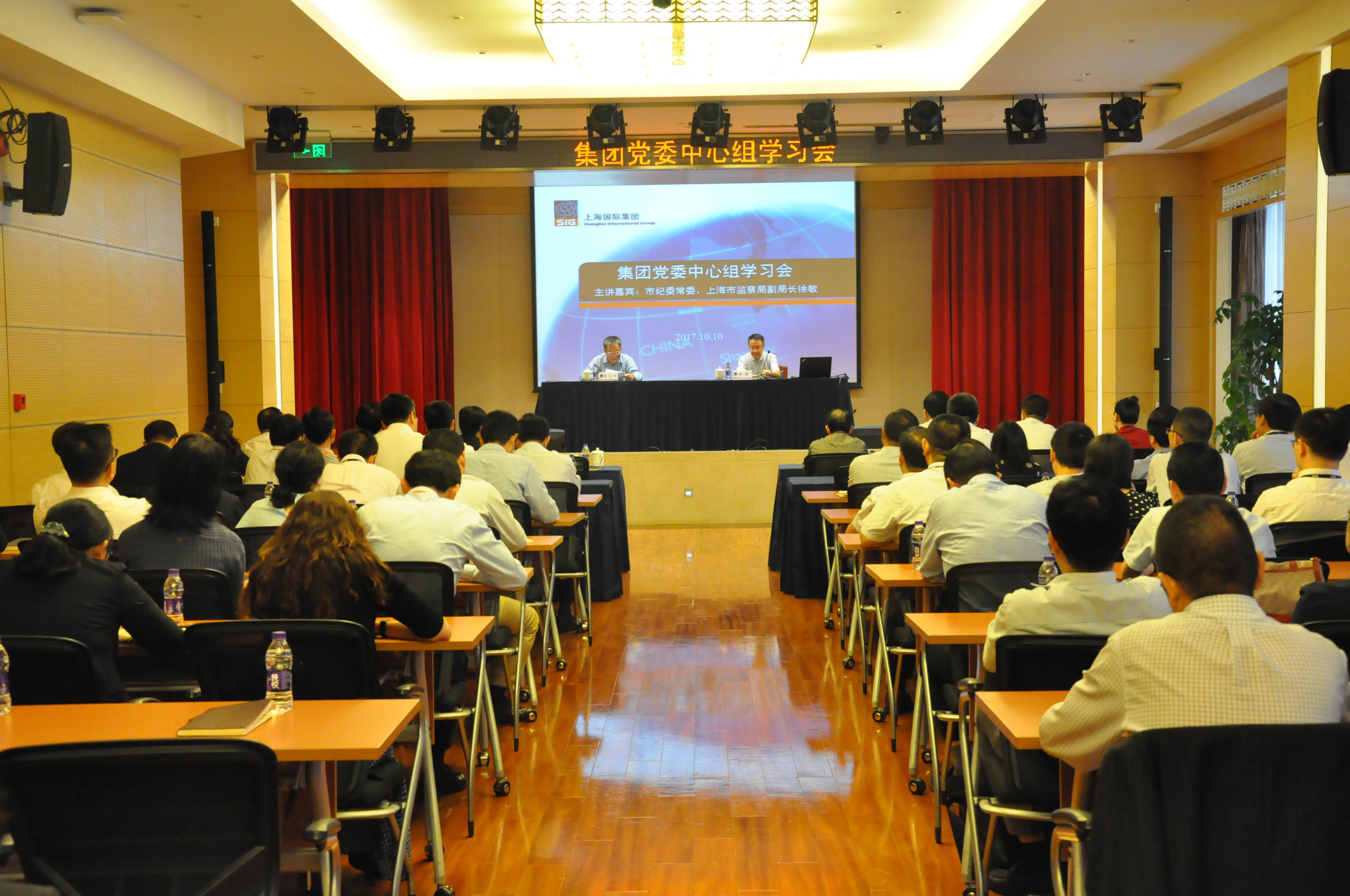 According to the study plan of the Party Committee Central Group of SIG and in order to further promote the party's work style and building a clean and honest government, on the afternoon of October 10, SIG organized study on the topic of Party Style and Building a Clean Government, inviting Xu Min, member of the Municipal Commission for Discipline Inspection and Deputy Director of the Municipal Supervision Bureau, with a theme on Unswervingly Implementation of the Eight-point Austerity Rules. The Lecture was presided over by Yu Beihua, Secretary of CPC SIG Committee and joined by more than 80 attendees including party and executive members, assistant-heads and above managed by CPC SIG Committee, SIG staff members and executives from subsidiaries.