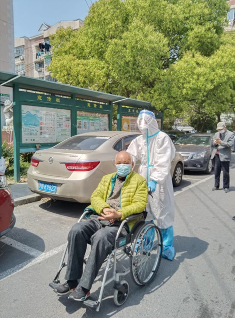 Wang Ke, Senior Manager at the Department of Investment Management, Shanghai SITICO Assets Management Co., Ltd., pushes an elderly resident in his wheelchair to the hospital to get a prescription filled