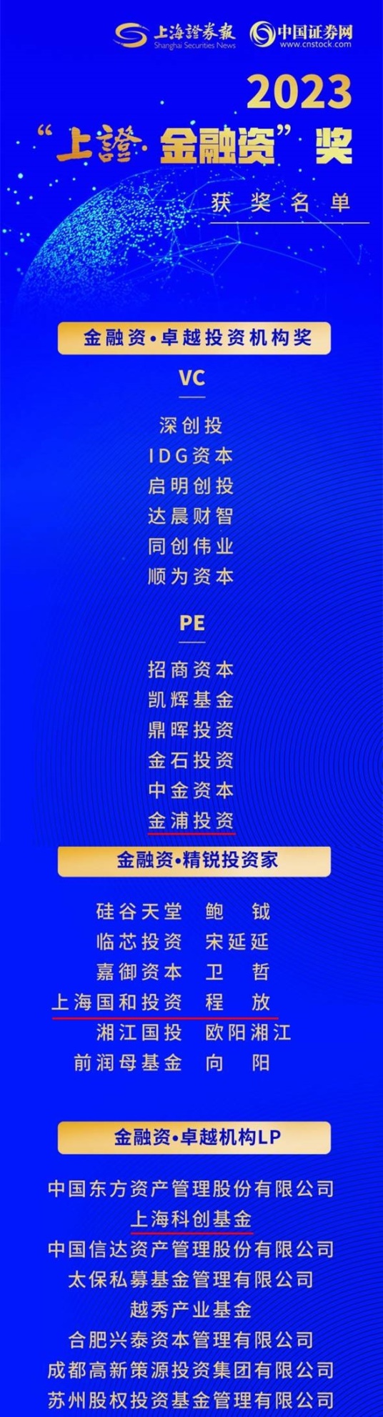11月30日,2023中国股权投资西岸科创金融大会暨“上证·金融资”奖颁奖典礼圆满落幕。备受市场瞩目的上海证券报·中国证券网第九届“上证·金融资”奖正式揭晓。集团旗下金浦投资获评“卓越投资机构奖(PE)”,上海科创基金获评“卓越机构LP”,上海国和投资程放获评“精锐投资家”。
