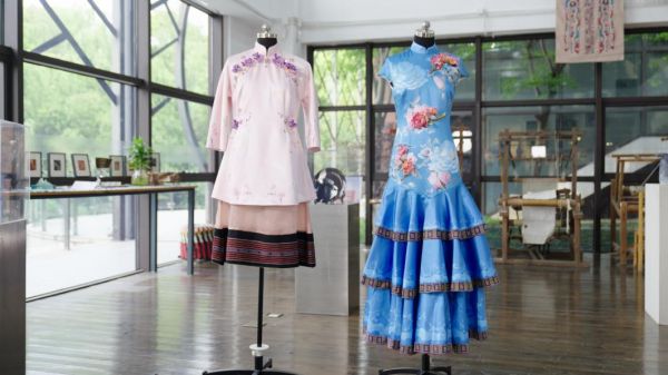 设计团队创作出的两件新中式礼服。杜海涛摄